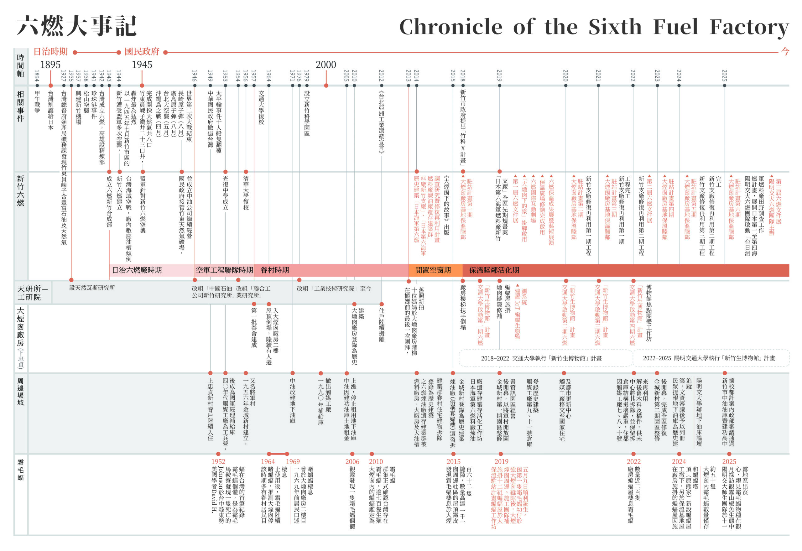 The Chronicle of the Sixth Fuel Factory, Hsinchu Branch provides a detailed record of the historical development of this site, tracing its transformation from a fuel factory of the Imperial Japanese Navy during the war to its current status as a post-war industrial relic undergoing urban regeneration and ecological conservation. The chronicle covers key moments in Taiwan’s energy development and military relics in the 1940s, including natural gas extraction in Zhudong, the construction of the Sixth Fuel Factory, bombings by Allied Forces, and other significant events. It also documents the local government’s recent efforts in promoting the “Good Neighborliness Residency Project at the Big Chimney Factory Base,” alongside the preservation and adaptive reuse of surrounding historical sites, such as Jiangjun Village and the underground fuel depot. In addition, the chronicle addresses ecological conservation issues concerning the Asian Parti-Colored Bats, reflecting on the possibility of coexistence between industrial relics and ecology. The development of the Sixth Fuel Factory reflects the broader transformation of Hsinchu—from a military and industrial hub to a center of science and technology—highlighting the importance of cultural heritage preservation and environmental sustainability.